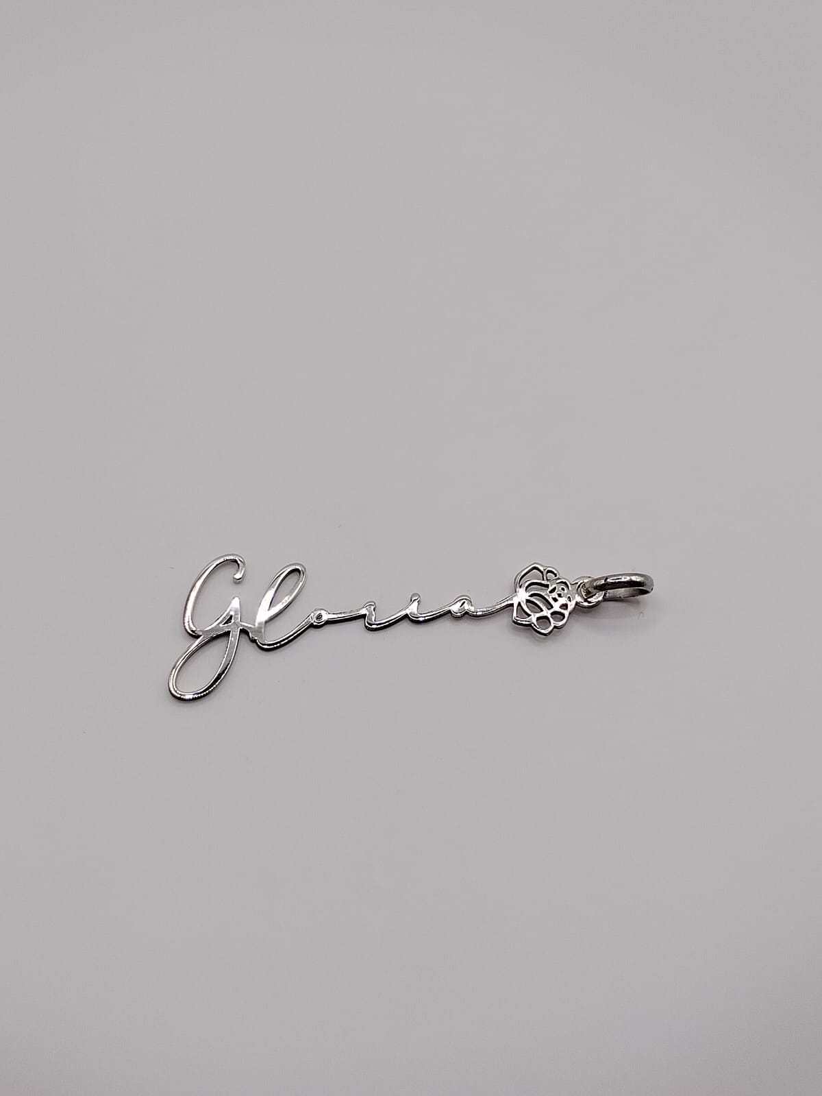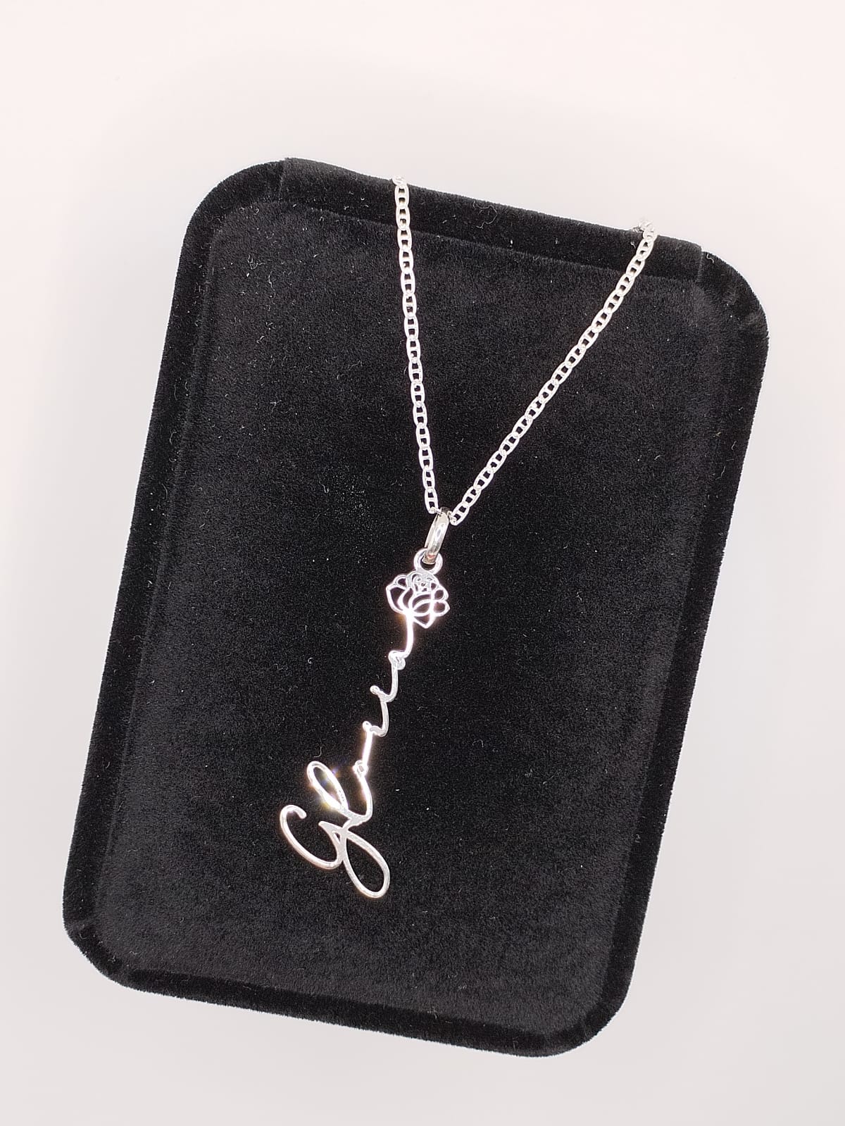 Dije de flor con nombre personalizable en cursiva hecho con plata .925