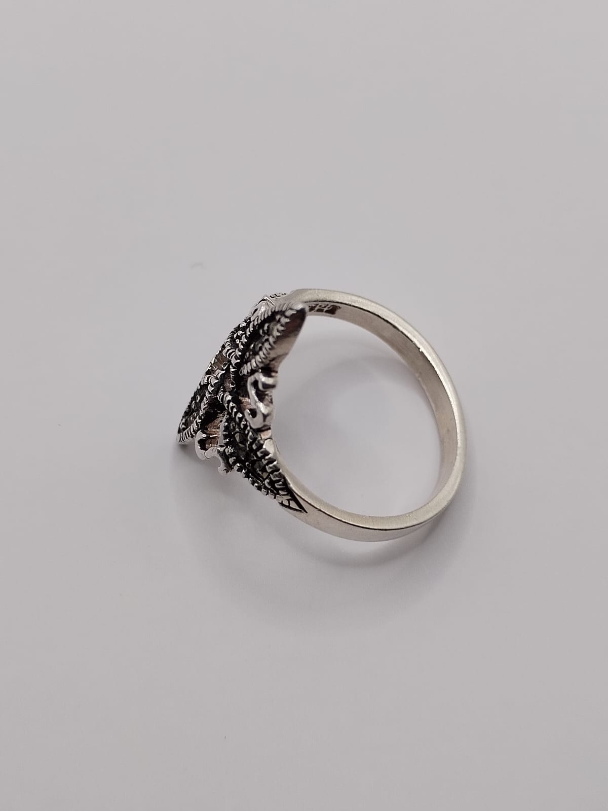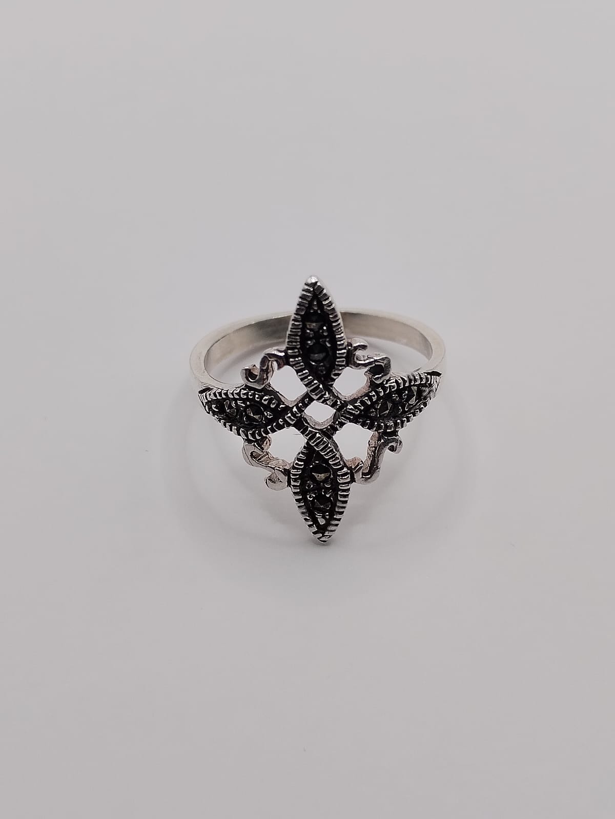 Anillo de nudo de bruja hecho con plata .925 con marquesitas color negro
