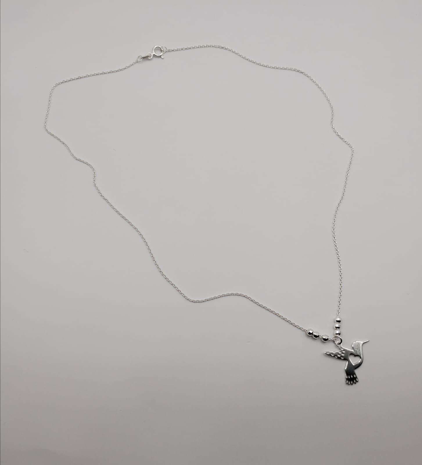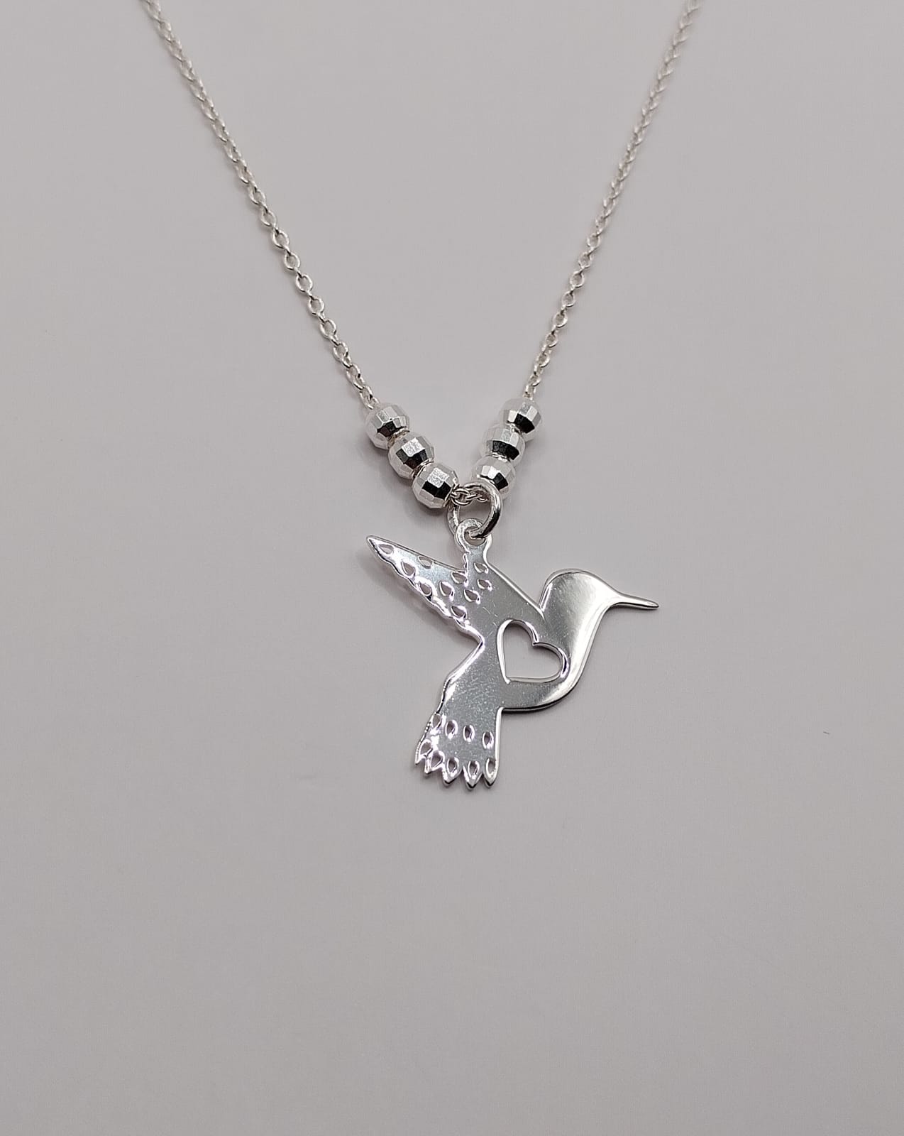 Bonito collar de colibrí con corazón en el centro en corte láser hecho con plata .925