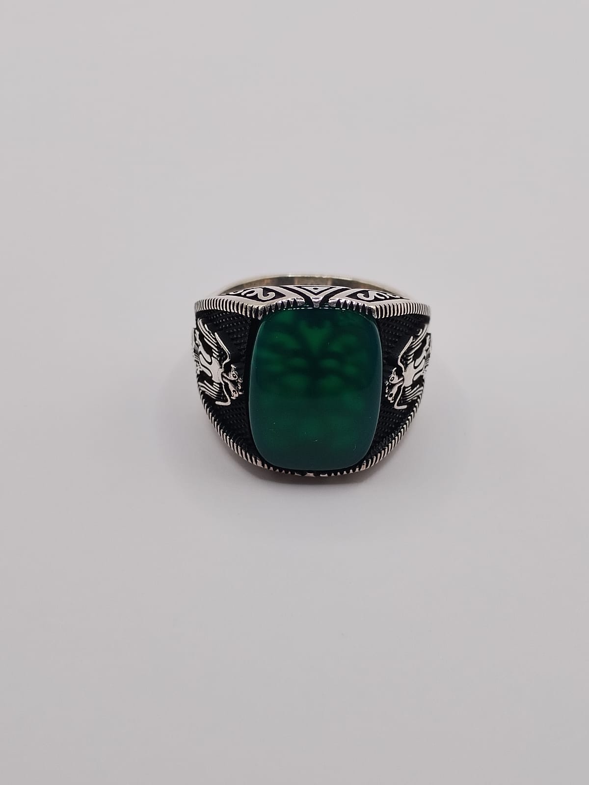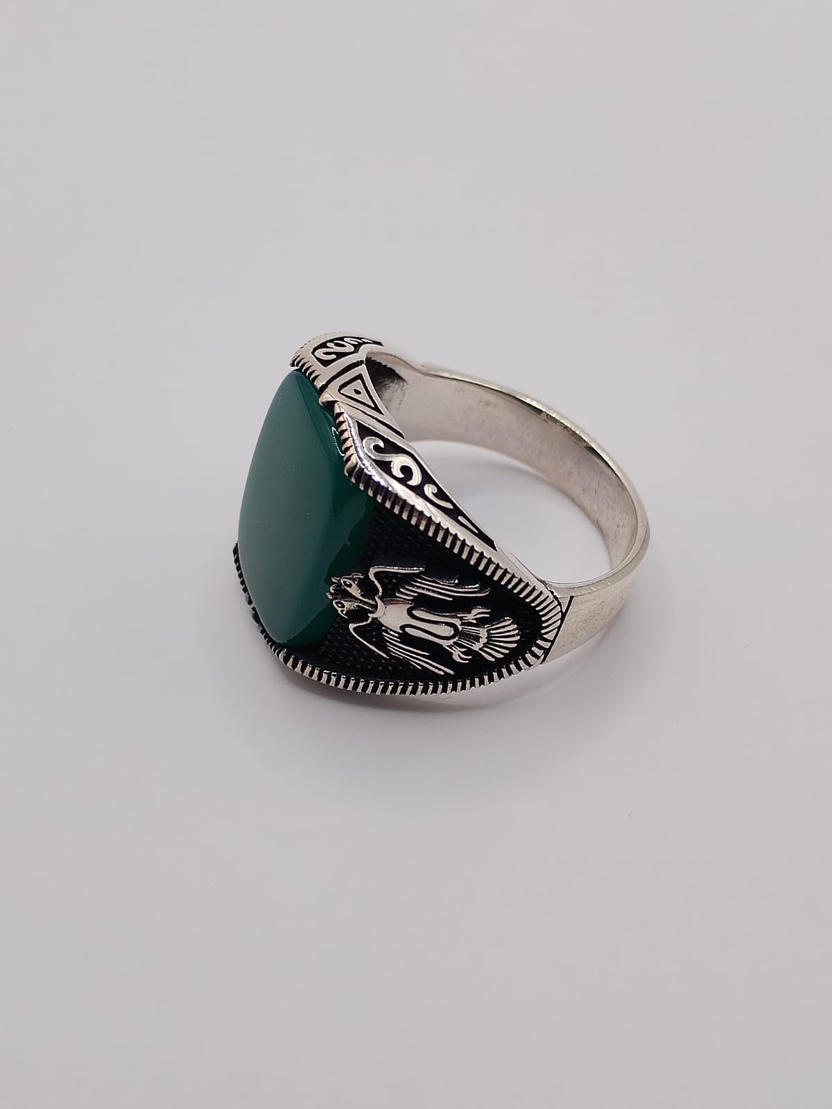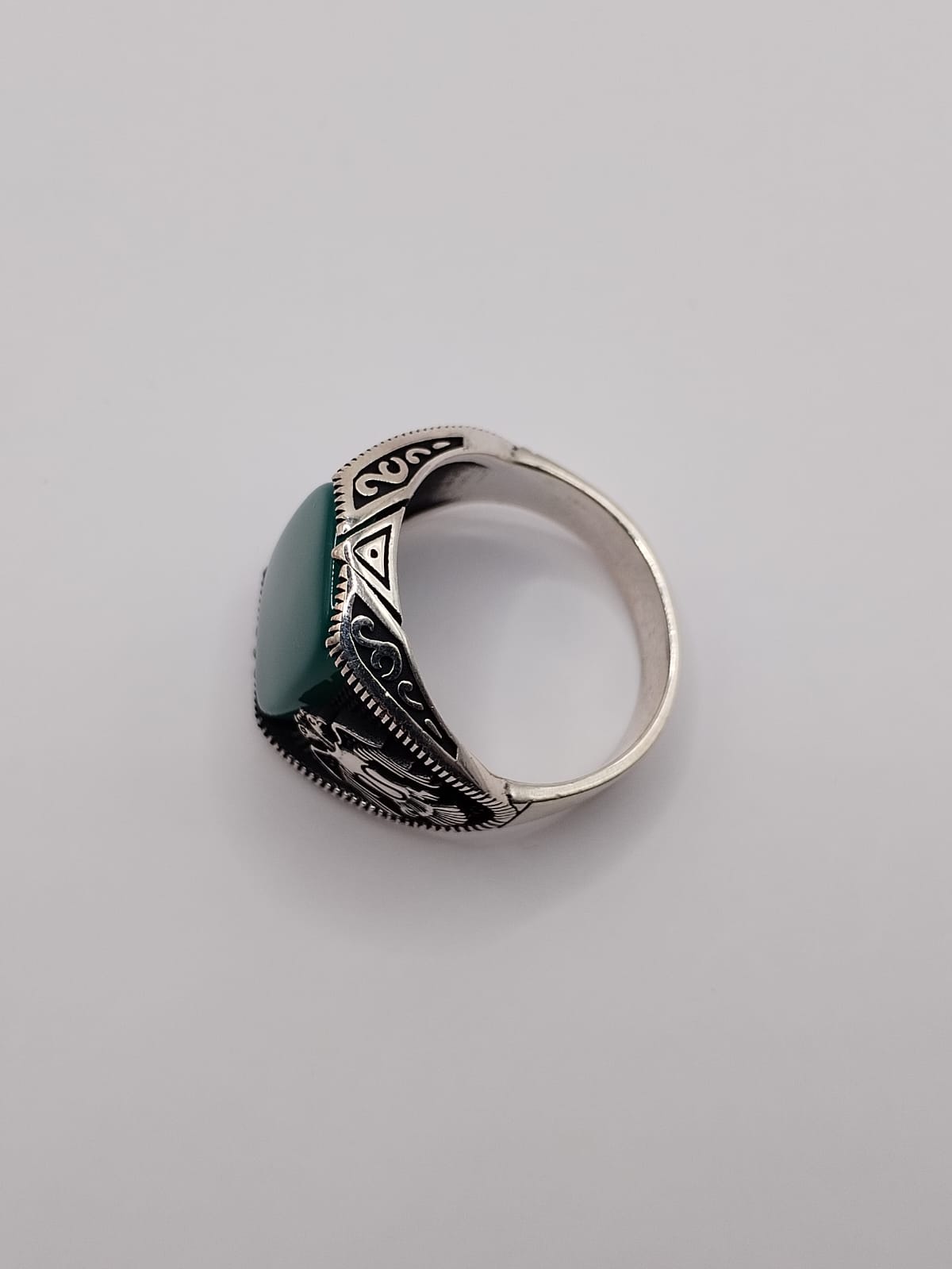 Elegante anillo barroco de caballero con esmeralda sintética hecho con plata .925