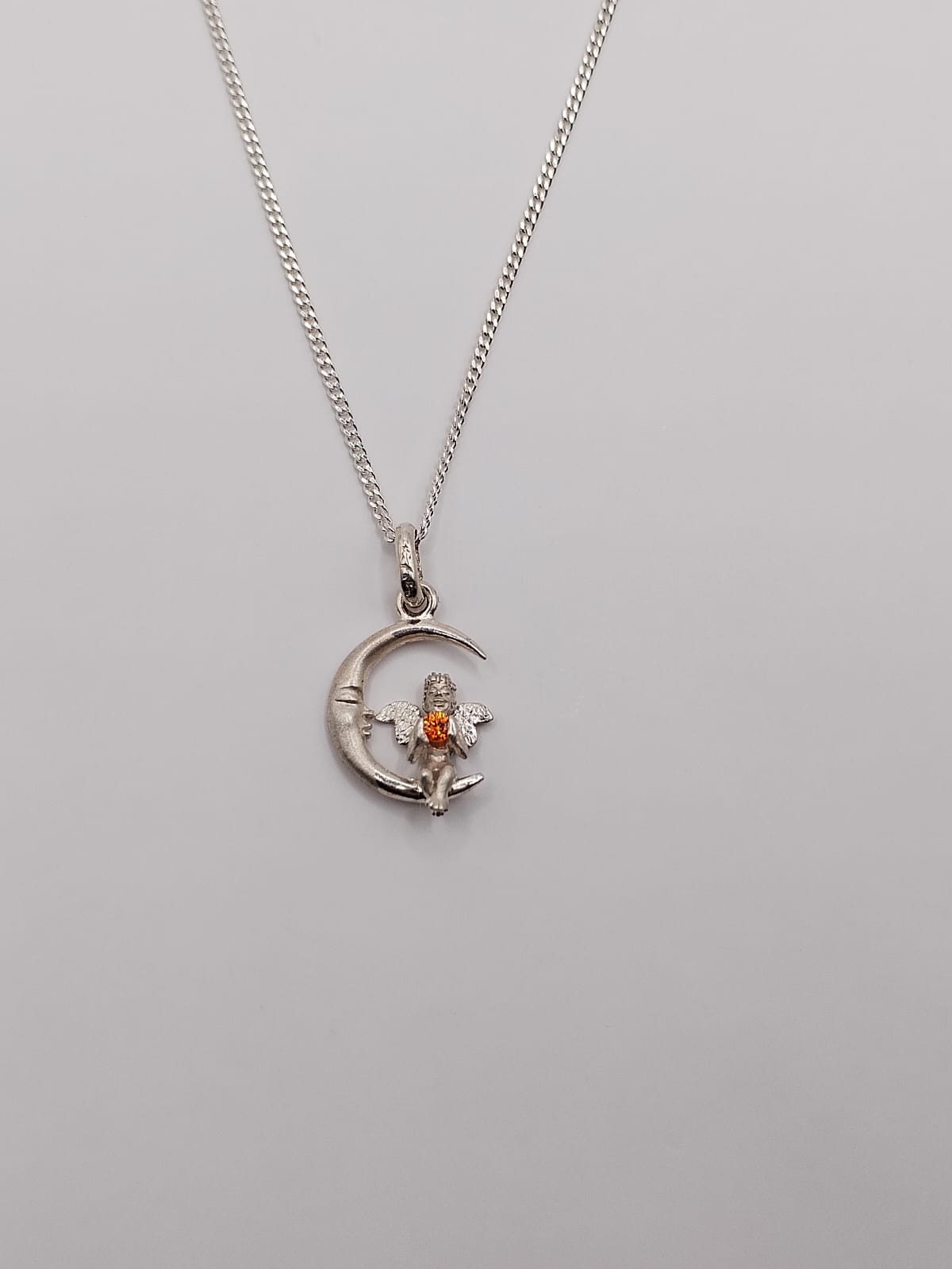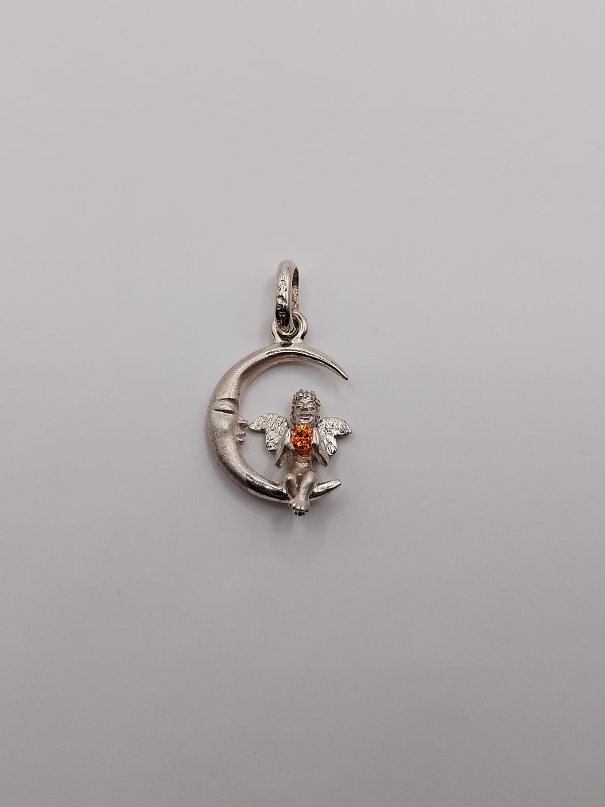 Fino dije de ángel en la luna con piedra naranja hecho con plata .925